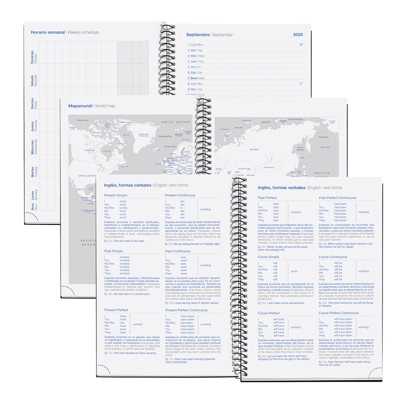Cubiertas de cartón forrado plastificado mate (agendas Design). Encuadernación en espiral metálico con hojas microperforadas en la esquina para señalar la fecha actual.
