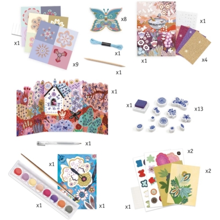 Conjunto muy completo con 6 actividades creativas y numerosos proyectos sobre el tema de las flores: pintura, dibujo, collage, plegado, tarjetas de rascar y escenas en 3D. ¡Hay para todos los gustos! Horas de actividades manuales para descubrir diferentes técnicas creativas y sumergirse en un jardín florido. Se incluyen todos los accesorios necesarios para que el niño realice cada actividad según sus gustos, despertando su curiosidad. El folleto explicativo paso a paso le guiará en sus creaciones.