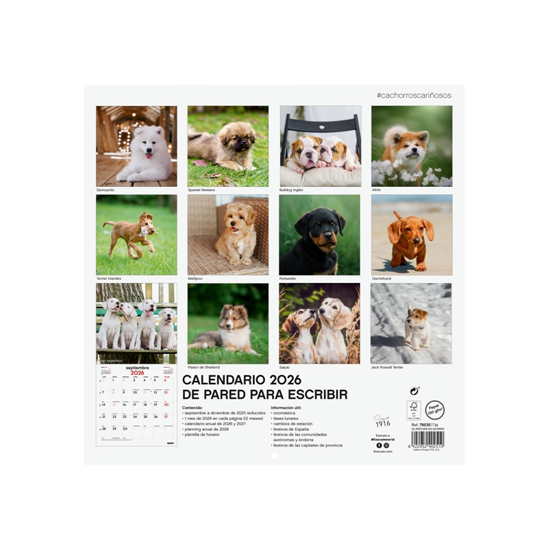 Calendario anual de pared con agujero en la parte superior para colgar. Perfecto para planificar. Temáticas variadas y una imagen diferente en cada mes, ideal para decorar la oficina o el hogar. Contiene información útil y de interés, espacio diario para anotaciones y mes anterior y posterior en cada página. Las medidas del calendario colgado son: 30×60 cm. Duración: Enero 2026 – Diciembre 2026 (12 meses) + Sep.-Dic. 2025 (4 meses) reducidos. Interior: Mes Vista. Para planificarse a nivel mensual. Con información de los festivos de España. La anualidad del calendario incluye la información relativa a: onomástica, festivos nacionales, festivos de las CC. AA., días señalados, fases lunares y cambios de estación. Detrás de la hoja de cada mes se puede consultar el calendario anual. El calendario dispone también de otros contenidos extra: calendarios reducidos de septiembre a diciembre del año anterior, calendario anual del año y del año siguiente, planning anual, listado de festivos de las CC. AA. y de las capitales de provincia e inicios de los años nuevos chino, musulmán, ortodoxo y hebreo. Idioma del artículo: español. Formato: 30X30 – 300×300 mm. Papel. 150 g/m². Papel FSC®.