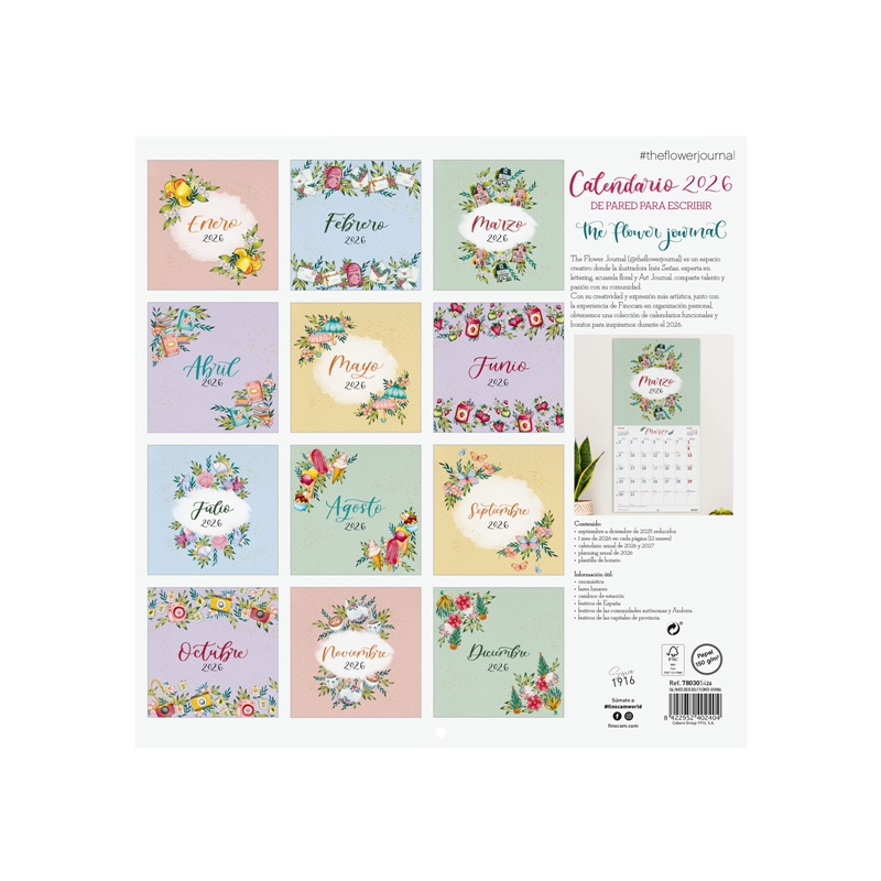 Calendario anual de pared con agujero en la parte superior para colgar. Perfecto para planificar. Temáticas variadas y una imagen diferente en cada mes, ideal para decorar la oficina o el hogar. Contiene información útil y de interés, espacio diario para anotaciones y mes anterior y posterior en cada página. Las medidas del calendario colgado son: 30×60 cm. Duración: Enero 2026 – Diciembre 2026 (12 meses) + Sep.-Dic. 2025 (4 meses) reducidos. Interior: Mes Vista. Para planificarse a nivel mensual. Con información de los festivos de España. La anualidad del calendario incluye la información relativa a: onomástica, festivos nacionales, festivos de las CC. AA., días señalados, fases lunares y cambios de estación. Detrás de la hoja de cada mes se puede consultar el calendario anual. El calendario dispone también de otros contenidos extra: calendarios reducidos de septiembre a diciembre del año anterior, calendario anual del año y del año siguiente, planning anual, listado de festivos de las CC. AA. y de las capitales de provincia e inicios de los años nuevos chino, musulmán, ortodoxo y hebreo. Idioma del artículo: español. Formato: 30X30 – 300×300 mm. Papel. 150 g/m². Papel FSC®.