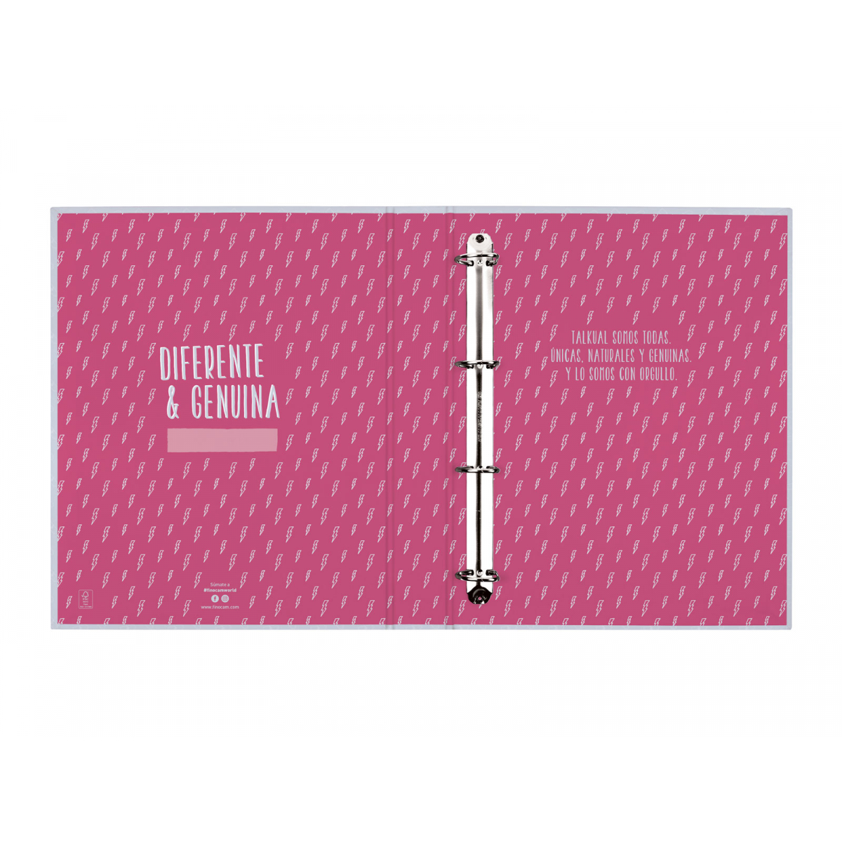 Carpeta de 4 anillas TALKUAL para chicas naturales, diferentes y únicas como tú. Somos #Talkual, #talkualsoy. Con cartón forrado con peliculado mate antirayaduras para el archivo y transporte de documentos formato DIN A4, folio y fundas. Anillas en D de Ø35 mm. Interior de las tapas diseñado.