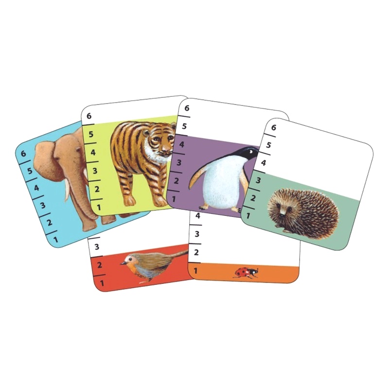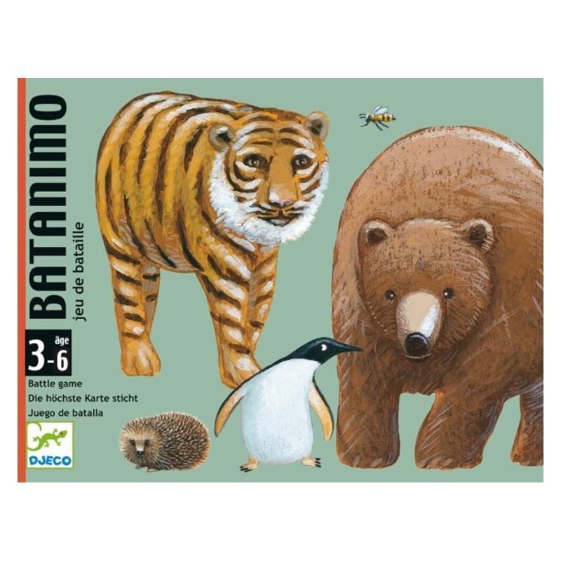 Un adorable juego de batalla para los más pequeños, con ilustraciones de animales variados. 1, 2, 3: los jugadores dan la vuelta a la vez a la primera carta de su mano. ¡Si hay varios animales del mismo tamaño, ¡hay «Batanimo»! Cuando un jugador ha ganado todas las cartas, gana la partida.