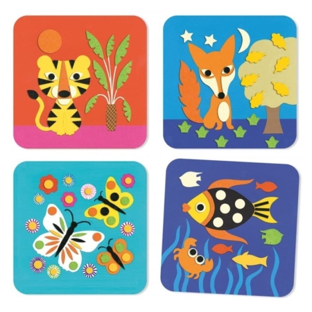 Una actividad de collage para hacer 4 cuadros con pegatinas de fieltro blando. Siguiendo el folleto explicativo, el niño ensambla y superpone las pegatinas de fieltro para hacer 4 suaves y coloridos dibujos de «animales».