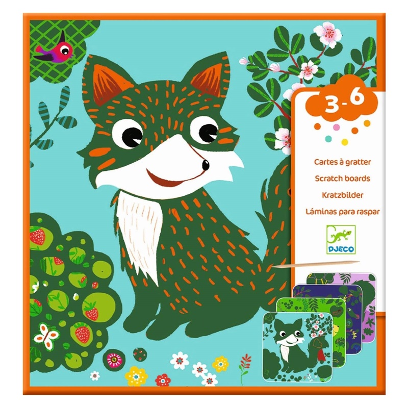 4 tableros para rascar con un palo de punta redonda, adecuado para los niños pequeños. Con el palo de madera y el folleto explicativo, el niño rasca la superficie de la tarjeta para hacer dibujos o descubrir sorpresas, ¡qué placer! Y aunque, llevado por su impulso, quiera rayarlo todo, el resultado también será bonito.