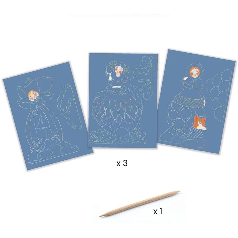 Contenido: 3 tarjetas para rascar (22 x 29 cm), 1 punzón de madera de punta doble y 1 folleto con instrucciones paso a paso a todo color.