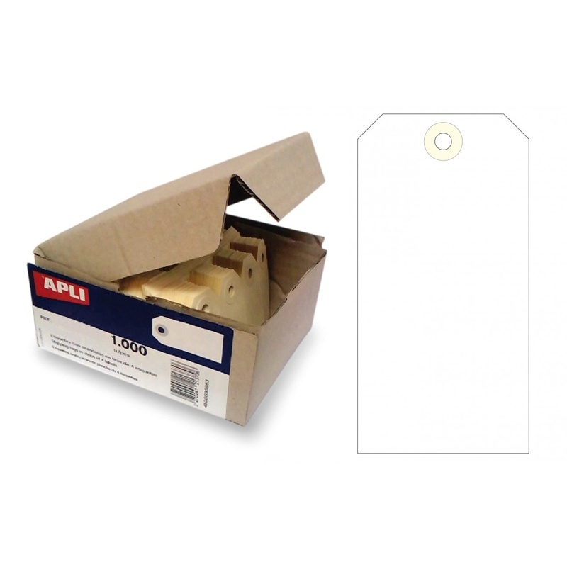 Etiquetas colgantes con arandela en color crema tamaño 125 x 63 mm. Cada caja incluye 1.000 etiquetas.