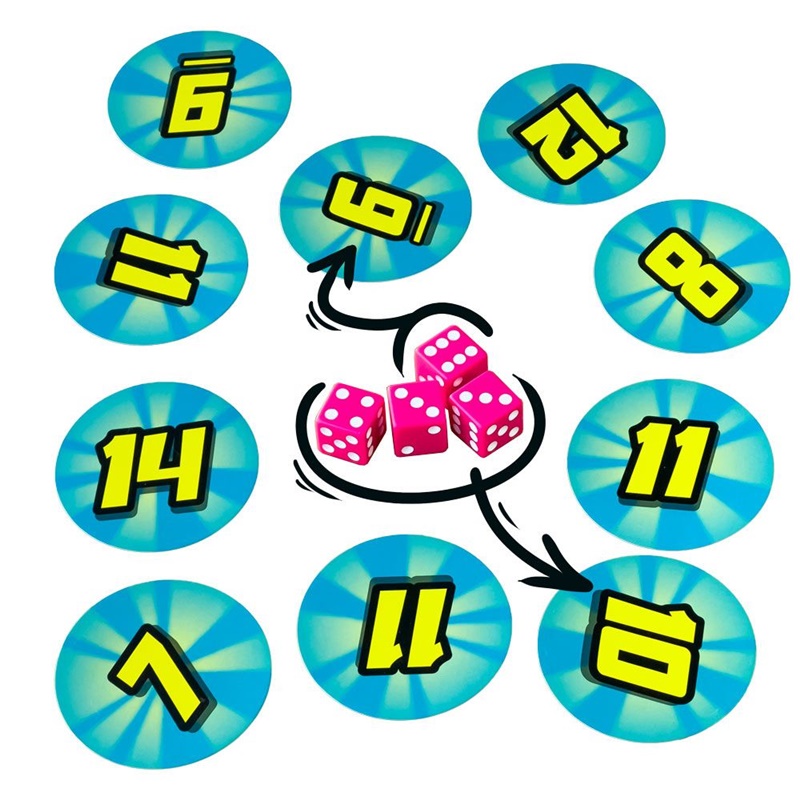 e inmediatamente todos deben intentar coger las cartas que coincidan con los números de los dados. Puede ser el número del dado o la suma de dos o más.