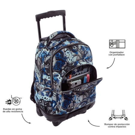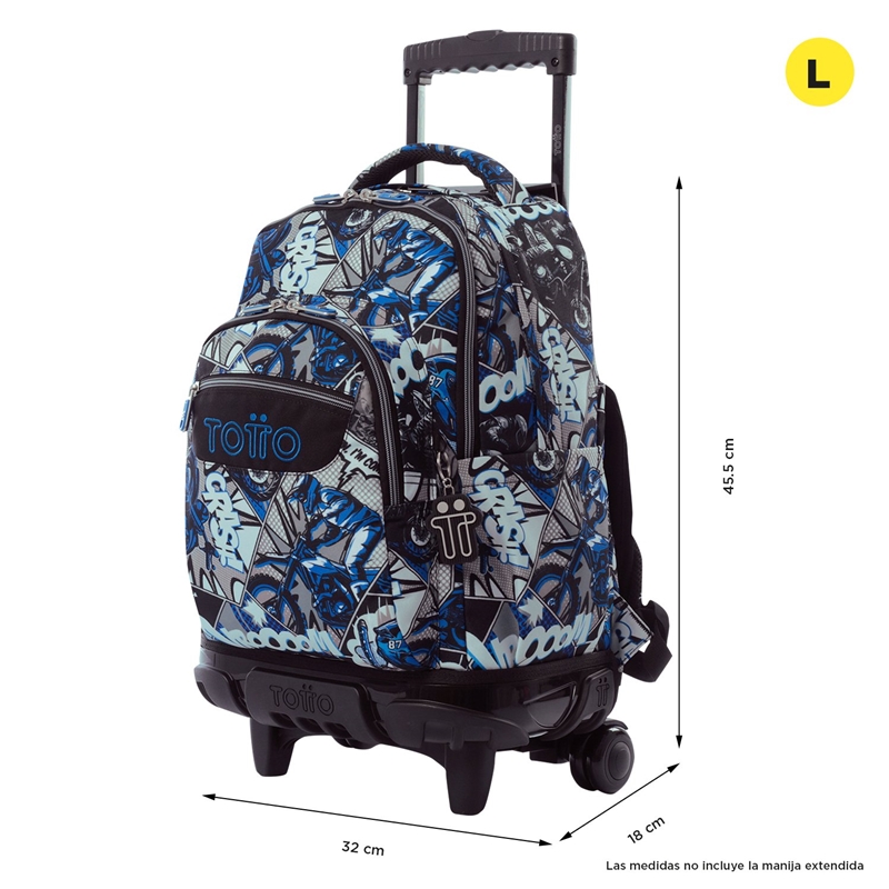 La mochila Renglones es ideal para escolares que necesitan un soporte cómodo para llevar libros y materiales, gracias a su diseño con ruedas y carro. Este modelo grande, fabricado en lona RPET a partir de botellas de plástico recicladas, combina funcionalidad con un enfoque ecológico. Ofrece un compartimento para PC de 15.4 pulgadas, organizador con portallaves, bolsillo para botella y ruedas de goma de alta resistencia con bumper de protección. Incluye manija telescópica, protector de correas y ruedas para evitar ensuciar la ropa al usarla en la espalda. Disponible en una amplia gama de estampados para ajustarse a los gustos de los pequeños. ¡Una opción práctica y consciente del medio ambiente!