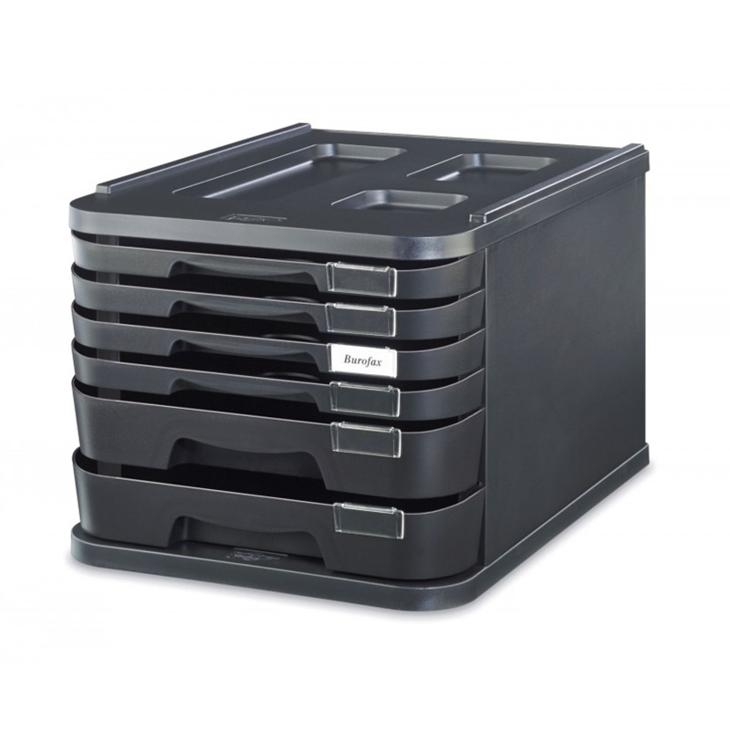 En poliestireno. Módulo con dos cajones de 5 cm. y cuatro cajones de 2,5 cm. para guardar documentos, con sistema de bloqueo, que evita la salida de los mismos. Con portaetiquetas en cada cajón. Diseñado para poder apilarse de forma vertical formando un sólido bloque. Con dos tapas decorativas. Medidas exteriores: 28,5×37,5×23 cm.
