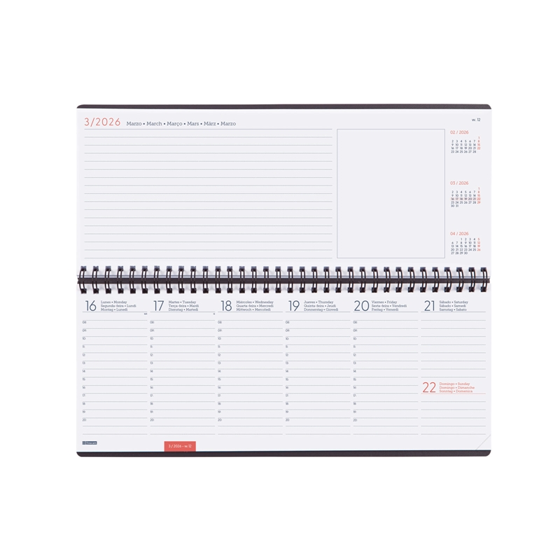 Planificador de sobremesa de tapa ligera de polipropileno y encuadernado con espiral doble. Visión de la semana en la parte inferior y anotar tareas/ideas en la hoja superior. Ideal para tu organización profesional y/o personal. Esquinas microperforadas para localizar rápidamente el día/semana en curso. Para facilitar la localización de cada mes, la anualidad incorpora un indicador en la parte inferior de las páginas. Contiene información de interés en la anualitat y otros contenidos extra. Duración: Enero 2026 – Diciembre 2026 (12 meses). Interior: Semana Vista + notas. Visión de la semana completa en vertical. Con horas. Con información en la anualidad de los festivos de los siguientes países: Argentina, Australia, Bélgica, Brasil, Suiza, Chile, Alemania, España, Francia, Reino Unido, Irlanda, Italia, Luxemburgo, Mónaco, México, Países Bajos, Polonia, Portugal, Rumanía, Rusia, Suecia, Ucrania y Estados Unidos. La anualidad del planificador incluye la información de los festivos internacionales y los inicios de los años nuevos chino, musulmán, ortodoxo y hebreo. El planificador dispone también de otros contenidos extra: datos personales, calendario del año y del año siguiente, plan anual del año y del año siguiente, festivos internacionales, códigos de países, hojas de checklist, hojas para notas y hojas para teléfonos, direcciones y e-mails. Artículo multilingüe: español, inglés, portugués, francés, alemán e italiano. Formato: 290×116 mm. Polipropileno, espiral doble metálica y papel. 80 g/m². Papel FSC®.