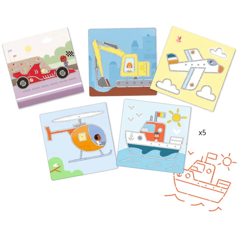 5 plantillas ilustradas sobre el tema de los vehículos (avión, coche, helicóptero, barco y grúa). Solo hay que seguir el dibujo de las hendiduras con el lápiz para trazar perfectamente todo tipo de vehículos. ¡Son de plástico, lavables y muy resistentes para reutilizarlas sin parar!