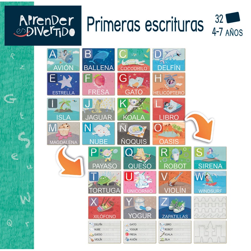 “Aprender es Divertido” es una colección de juegos especialmente creada para acompañar al niño/a en su proceso de crecimiento y aprendizaje, potenciando el desarrollo de sus capacidades, habilidades y personalidad. Con este divertido juego podrán iniciarse en el aprendizaje de la escritura. Cada lámina contiene un dibujo acompañado de una letra, que es su inicial, cenefas sencillas para practicar el trazo o palabras completas para repasar. Láminas borrables y reutilizables. Contenido: 16 láminas a doble cara con 32 ilustraciones, 1 rotulador, 1 borrador, instrucciones.