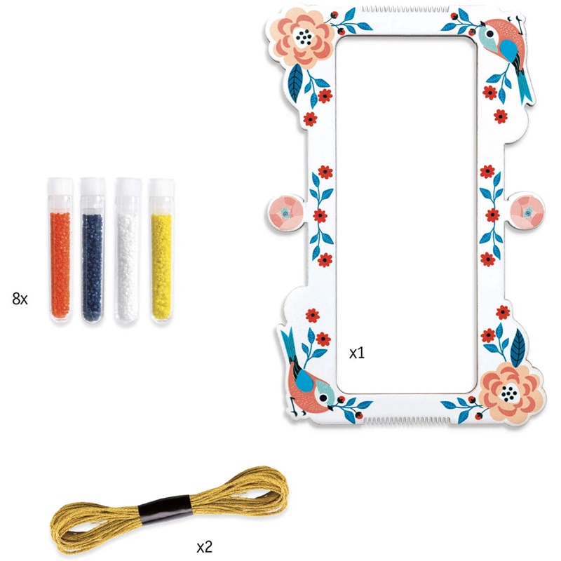Contenido: 8 tubos de cuentas (8 colores), 1 telar, 2 carretes de hilo dorado y 1 folleto explicativo paso a paso.