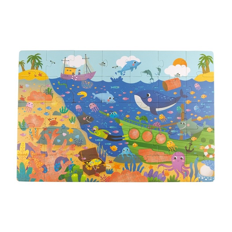 ¡Reconstruye el puzzle de 35 piezas y descubre todos los secretos del océano, ocultos en el agua, usando las gafas de lentes especiales incluídas! Un divertido juego que estimula la atención y la curiosidad de los niños. Hecho con cartón de alta calidad. Tamaño pieza de 8-12cm. Medidas del puzzle: 60 x 40 cm.