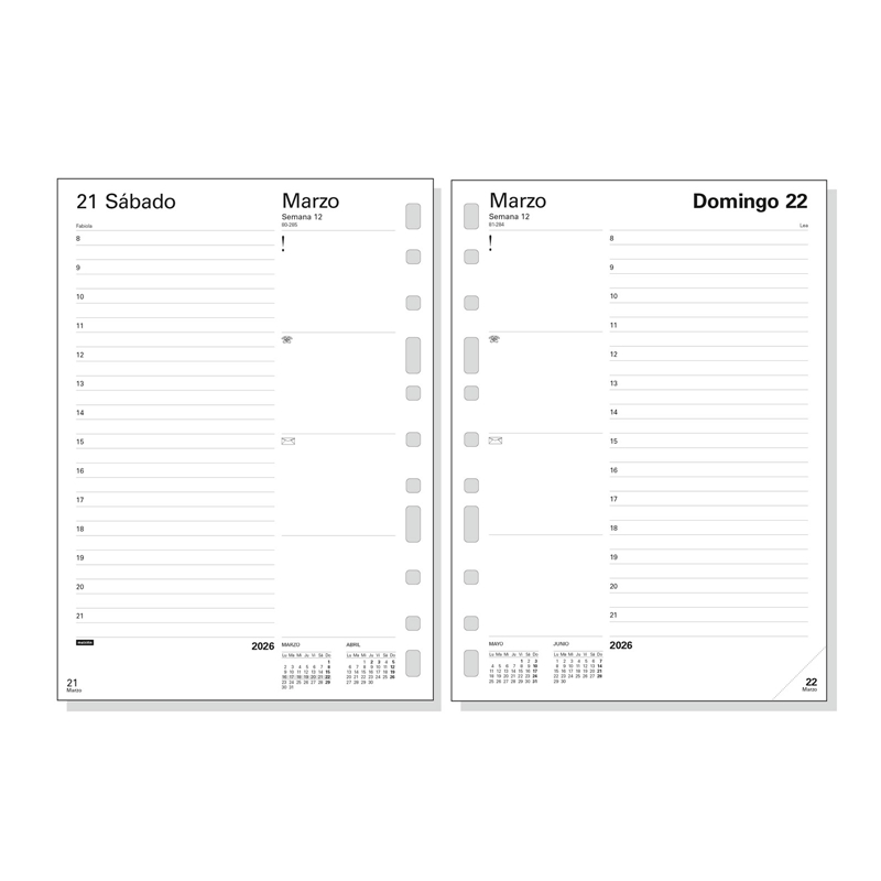 Recambio anual para las agendas de 11 anillas Multifin. También válido para agendas de 4 anillas. Con esquinas microperforadas para localizar rápidamente el día/semana en curso. La anualidad contiene información de interés y otros contenidos extra. Duración: Enero 2026 – Diciembre 2026 (12 meses). Interior: 1 Día Página. Amplio espacio de escritura para cada día. Con horas desde las 8:00h hasta las 21:00h. Sábados y domingos en página completa. Con información de los festivos de España. La anualidad de la agenda incluye la información relativa a: onomástica, festivos nacionales, días transcurridos y días por transcurrir e inicios de los años nuevos chino, musulmán, ortodoxo y hebreo. La agenda dispone también de otros contenidos extra: datos personales, calendarios y plan anual desplegable. Idioma del artículo: español. Formato: 3002 – 155×215 mm. Papel. 70 g/m². Papel FSC®.
