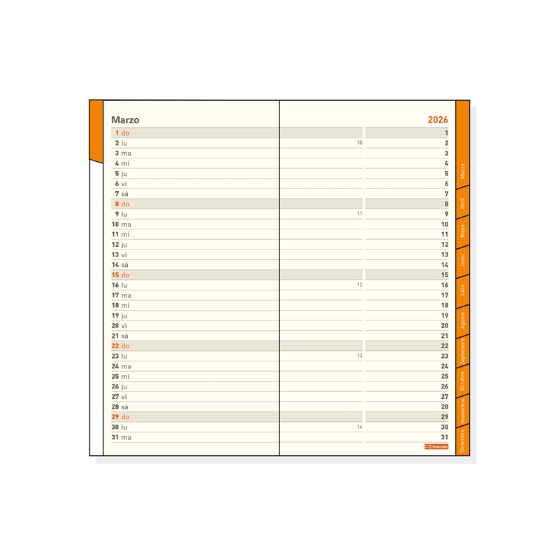 Recambio anual para agendas encuadernadas de bolsillo Finocam Plana. Incluye información de interés en la anualidad y otros contenidos extra. Duración: Enero 2026 – Diciembre 2026 (12 meses). Interior: Mes Vista. Para planificarse a nivel mensual. Con información de los festivos de España. Identidad, información, anualidad, notas, teléfonos y calendarios. Idioma del artículo: español. Formato: PL4 – 80×150 mm. Papel. 90 g/m². Papel FSC®.