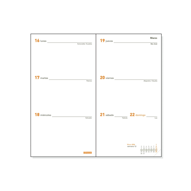 Recambio anual para agendas encuadernadas de bolsillo Finocam Plana. Incluye información de interés en la anualidad y otros contenidos extra. Duración: Enero 2026 – Diciembre 2026 (12 meses). Interior: Semana Vista Horizontal. Visión de la semana completa en horizontal que permite la escritura natural. Con información de los festivos de España. Identidad, información, anualidad, notas, teléfonos y calendarios. Idioma del artículo: español. Formato: PL4 – 80×150 mm. Papel. 60 g/m². .