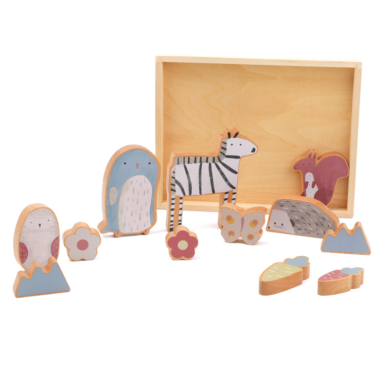Mezcla todas las piezas e intenta colocarlas dentro de la caja de madera. Caben todas! Medidas de la caja 25 x 19,5 cm. Piezas de 3,5 a 12,5 cm. Grosor 1,5 cm.