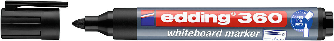 Tras una reunión intensa o al dejar un mensaje en casa con las prisas puede suceder que uno se olvide de volver a tapar el marcador. Con el marcador para pizarras blancas edding 360 no hay por qué preocuparse. Puede dejarse destapado durante varios días sin secarse, para que cualquiera pueda usarlo inmediatamente. Y lo que es aún mejor, la escritura puede borrarse fácilmente de cualquier pizarra blanca sin dejar ni rastro. Este edding también escribe perfectamente sobre otras superficies lisas no porosas, como esmalte, vidrio o melamina. Su punta redonda garantiza un trazo uniforme, es resistente a la acción de la luz y de secado rápido. Es la solución fiable para cualquiera que use pizarras blancas constantemente.