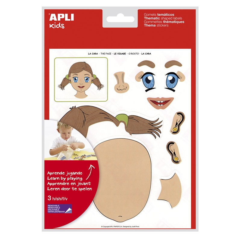 Cada bolsa contiene 12 hojas, niño y niña, (144 gomets). Este tipo de gomets, desarrollados con la colaboración de educadores, ayudan a los niños a identificar las diferentes partes de la cara colocando las distintas partes en el lugar apropiado. Además, esta actividad permite a los niños desarrollar sus habilidades motoras. Gomets de adhesivo removible para que puedan corregir si se equivocan.