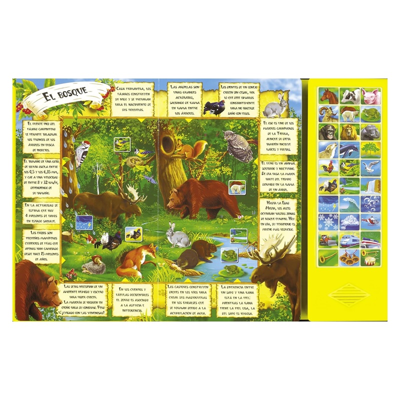 Con este libro podrás explorar los hábitats de nuestro planeta: adentrarte en la calurosa sabana, perderte en la espesura de la selva, bucear en las profundidades oceánicas…Sólo tienes que abrir el libro, pulsar los botones sonoros y dejar volar tu imaginación hasta los parajes más increíbles de la Tierra.